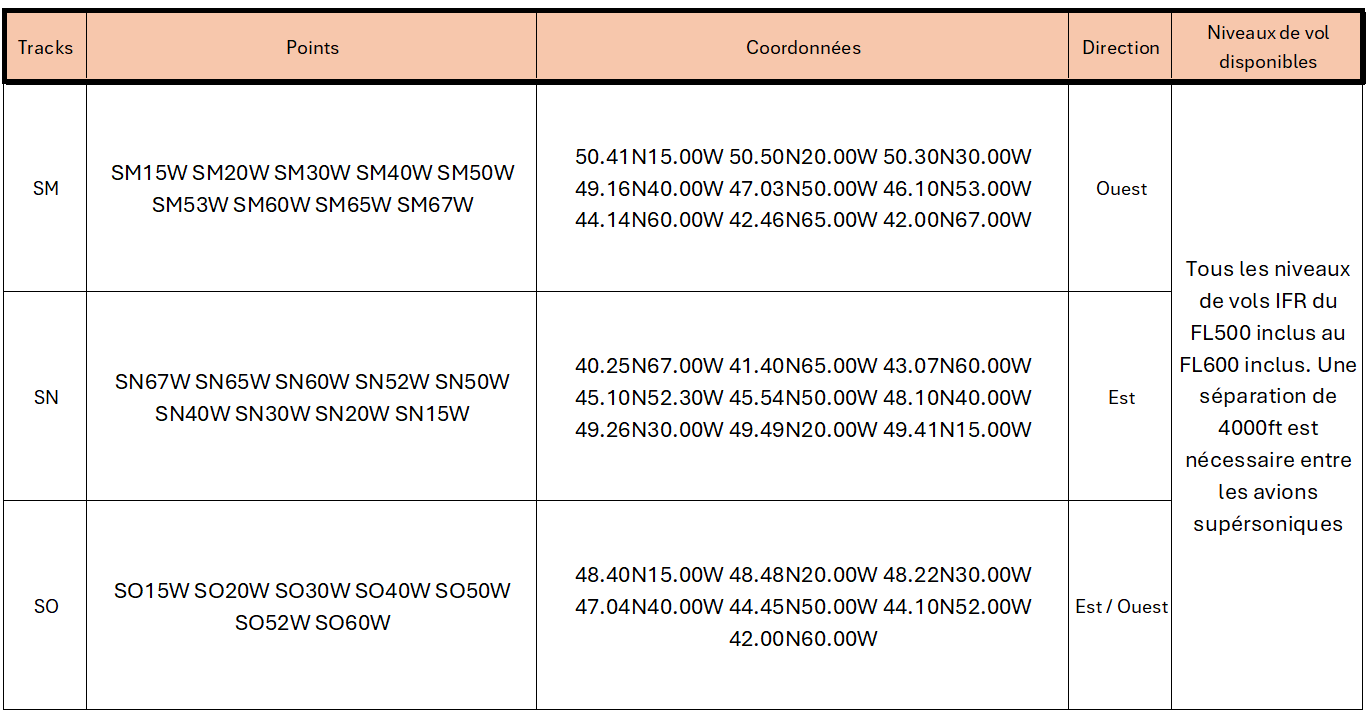 Le Concorde pouvant voler jusqu’au FL600, il se trouvait alors en dehors des tracks. Trois tracks avaient donc spécialement été créés pour l’appareil: le track Sierra Mike (SM), le track Sierra Novembre (SN) et le track Sierra Oscar (SO). Le tableau suivant détaille chacun de ces tracks.
