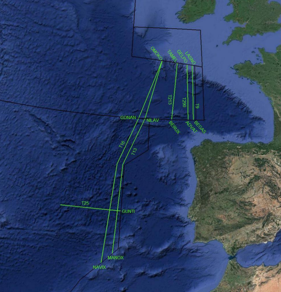 Les deux routes les plus proches du continent (T9 et T290) peuvent être empruntées part des avions qui ne respectent pas les normes d’équipements requis pour les opérations océaniques. Plus d'informations sur les équipements en NAT ici.