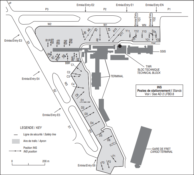 L’aire de trafic se situe à l’ouest du terrain (Parkings L et K). Les parkings commerciaux se situent des portes Y aux portes D. Les parkings FRET se situent aux portes F. Les parkings militaires se situent entre la piste 23/05 et la piste 29/11 (parkings M).