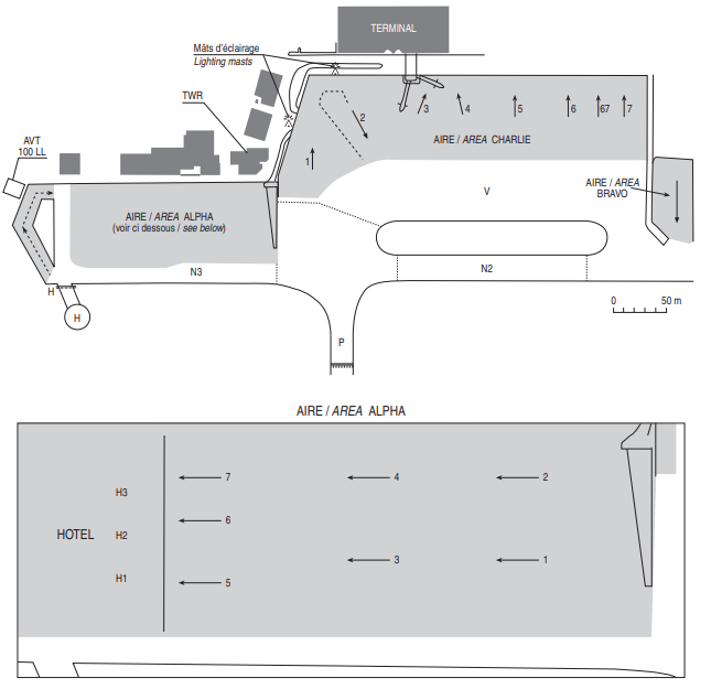 L’aire de trafic se compose des parkings A et B pour l'aviation générale et C pour l'aviation commercial. Il n'y a pas de terminal cargo.
