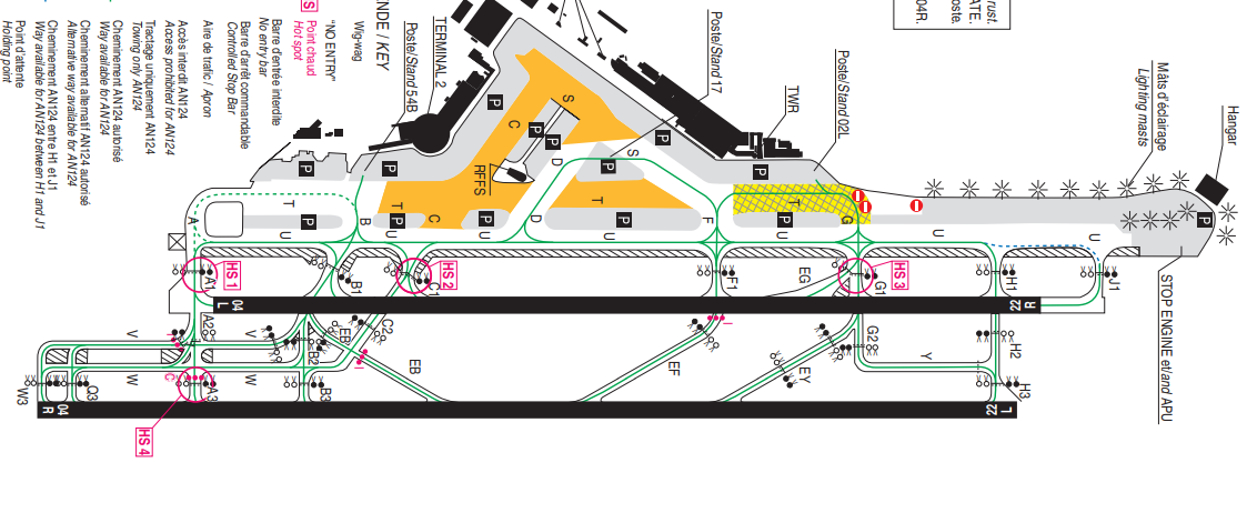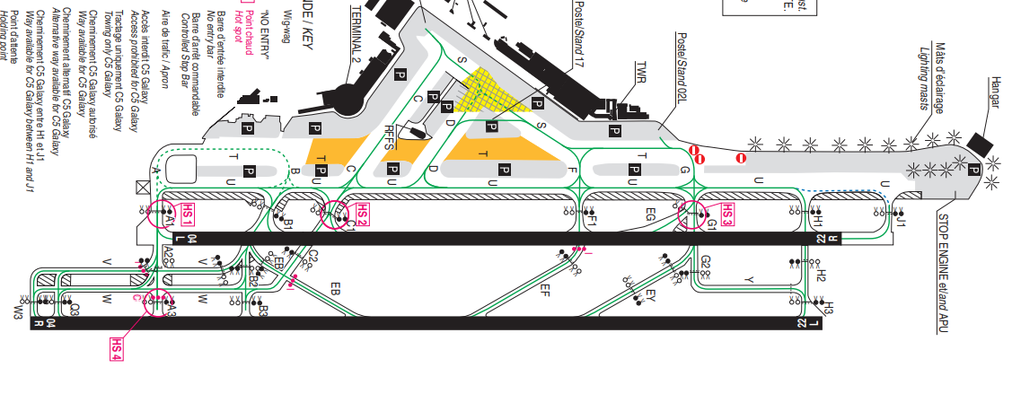 La plateforme étant en constantes évolutions ces dernières années certains points sont à prendre en compte comme l’extension du Terminal 2 (portes pairs 56 à 62) qui était anciennement l’aviation général. Il n’est pas à exclure que des pilotes n’ayant pas de scènes récentes se connectent ici.